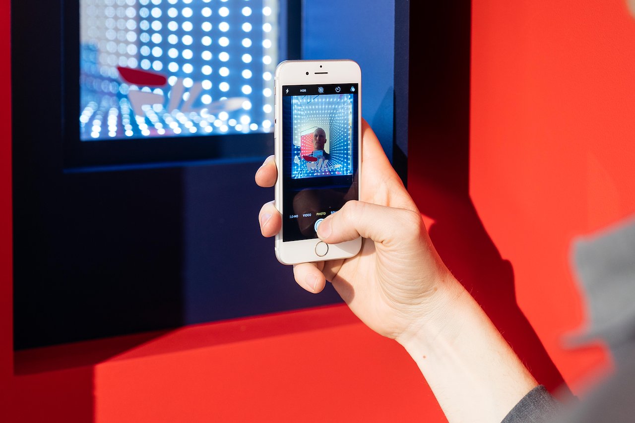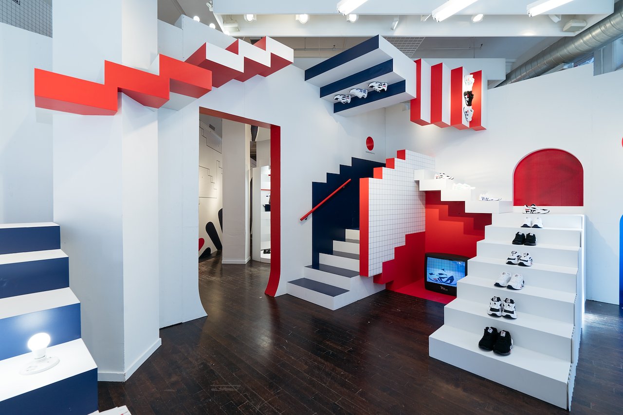 Throughout the store we seamlessly sprinkled some impromptu Insta fun including : A 90 style TV that broadcasted live feeds from four hidden security cameras, an infinity mirror hidden behind nesting doors, and shelves that registered the shoe when placed on it.